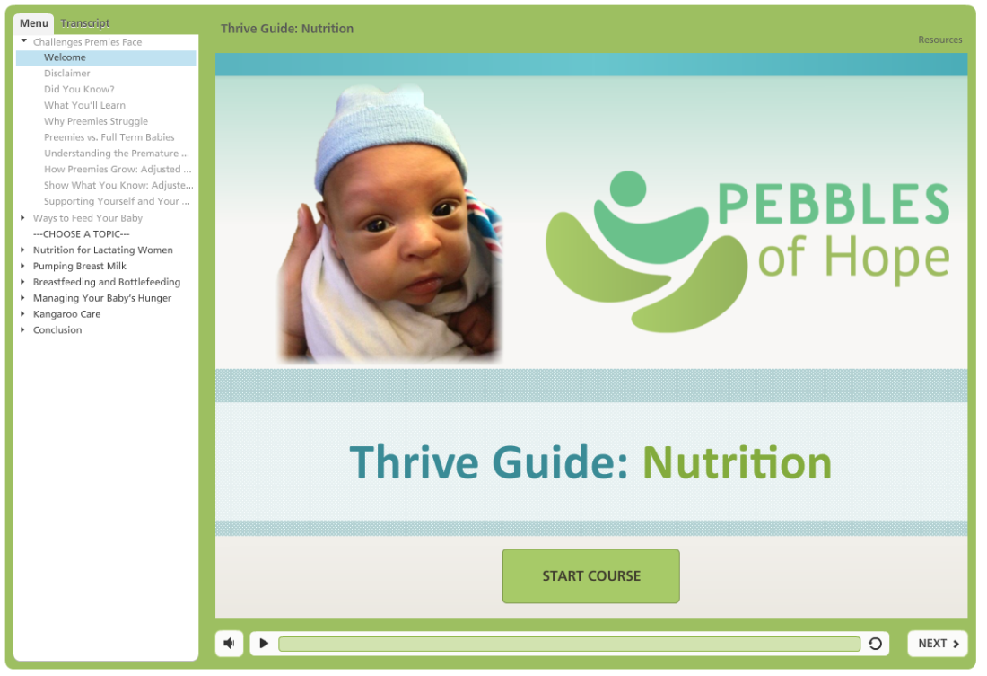 The Pebbles of Hope Thrive Guide is an interactive course – available online, on CD-ROM and via mobile devices – provided free-of-charge to parents and caregivers of premature infants in under-served areas to give them the information they need to provide the best care for their babies. This tool includes video, animation, audio and text to convey key concepts. The first module of the program, which will be piloted in this study, focuses on nutrition and covers topics such as breastfeeding, expressing breast milk, nutrition for lactating mothers and Kangaroo Care as a means to stimulate milk production.  The course can be accessed here.